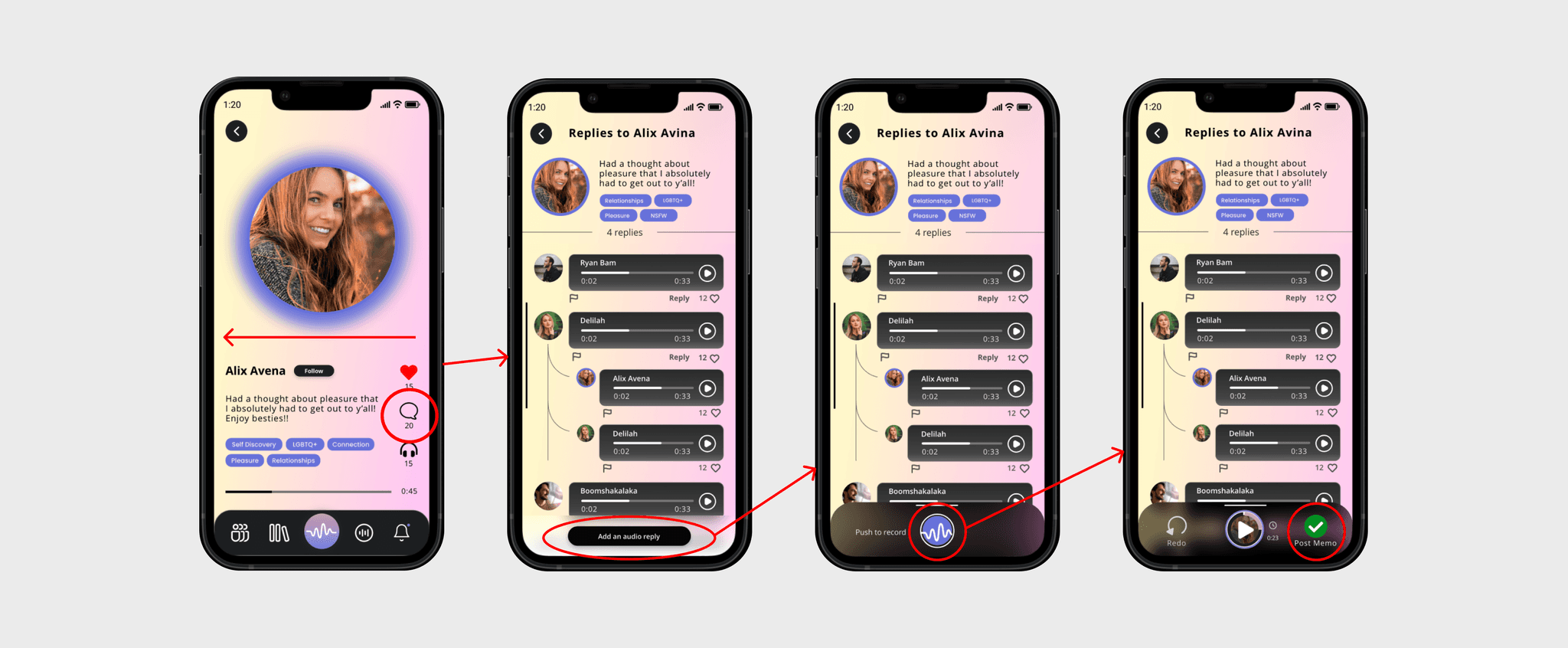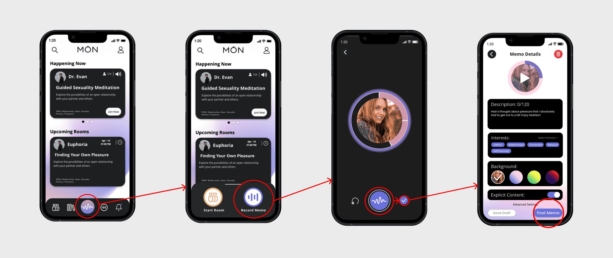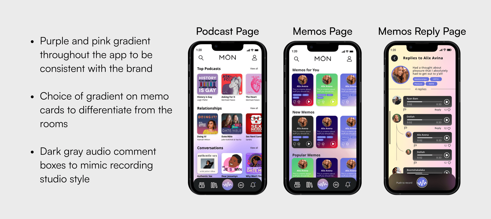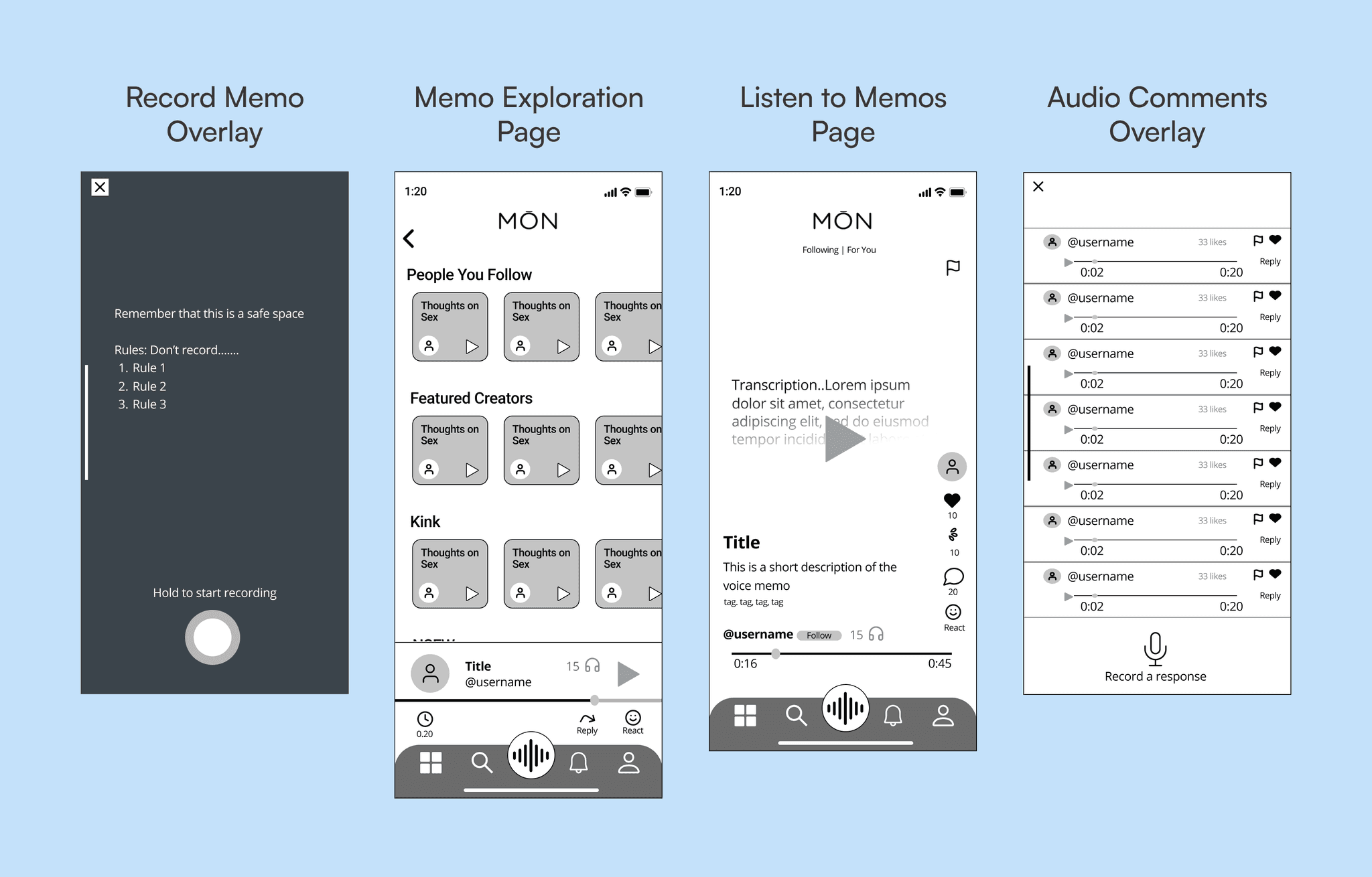 Design a feature that allows users to post audio memos, which also allows for audio comments and replies, for MŌN’s next role out. Also address where this feature will live, how it will be interacted with.