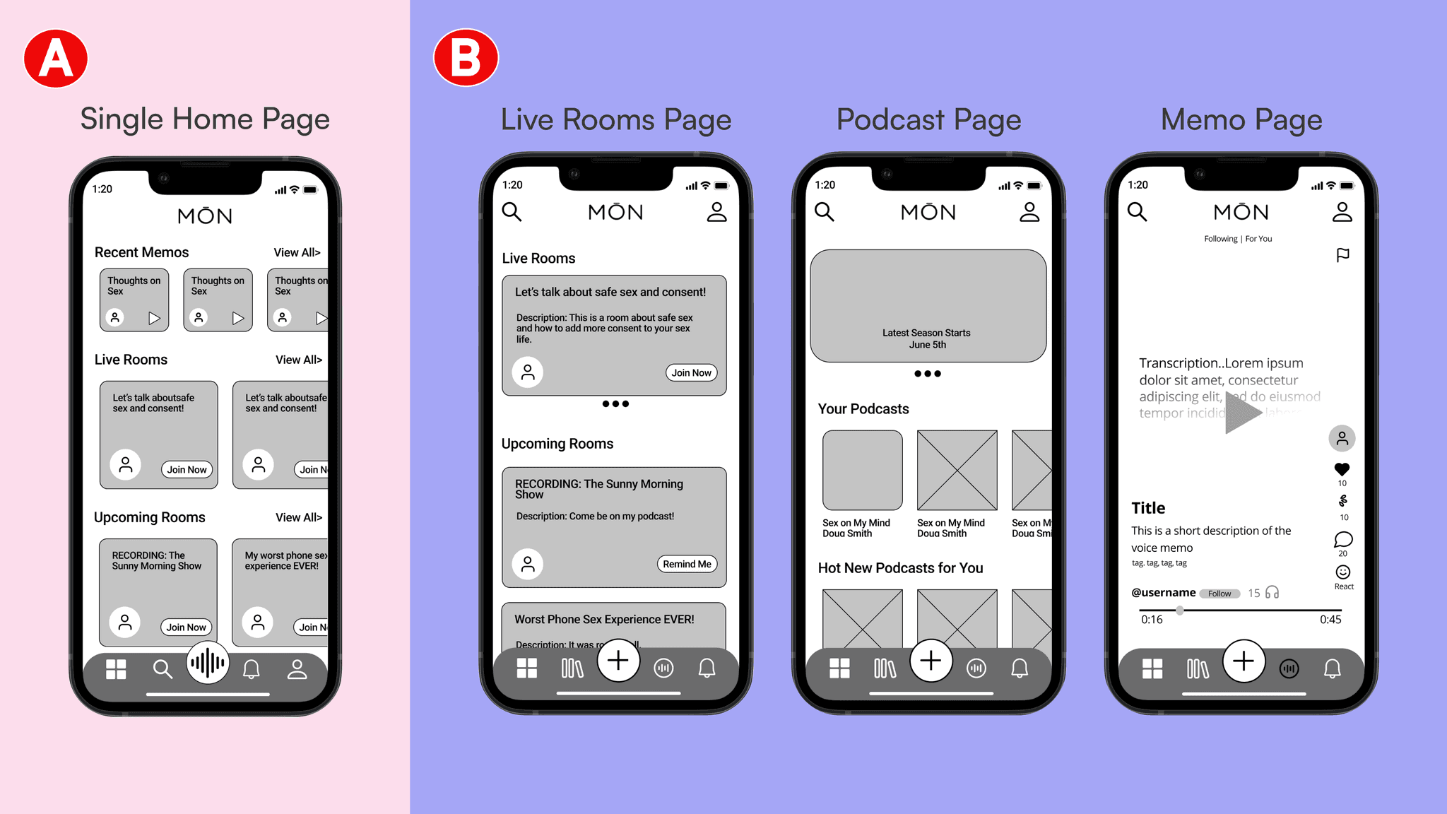 Ideation consisted of two sessions of sketching, in which we selected the best ideas from the team. As interaction design lead I was able to make major contributions to this part of the process by suggesting, what became, the main style of functionality for memos. We gained clear direction for how users would be able to post and interact with memos. We decided to implement a full screen swipe-to-scroll format popular among major social media platforms, but elaborated on common patterns in the design of MŌN memo’s comments and replies. Here, users would be to reply the original post with short fifteen-second audio comments and thread series of additional audio clips off individual comments. The functionality blends patterns established on TikTok and Reddit.
