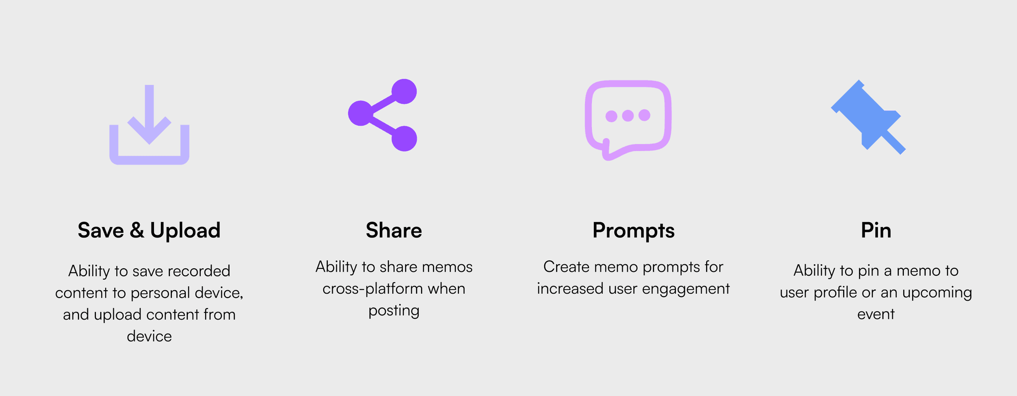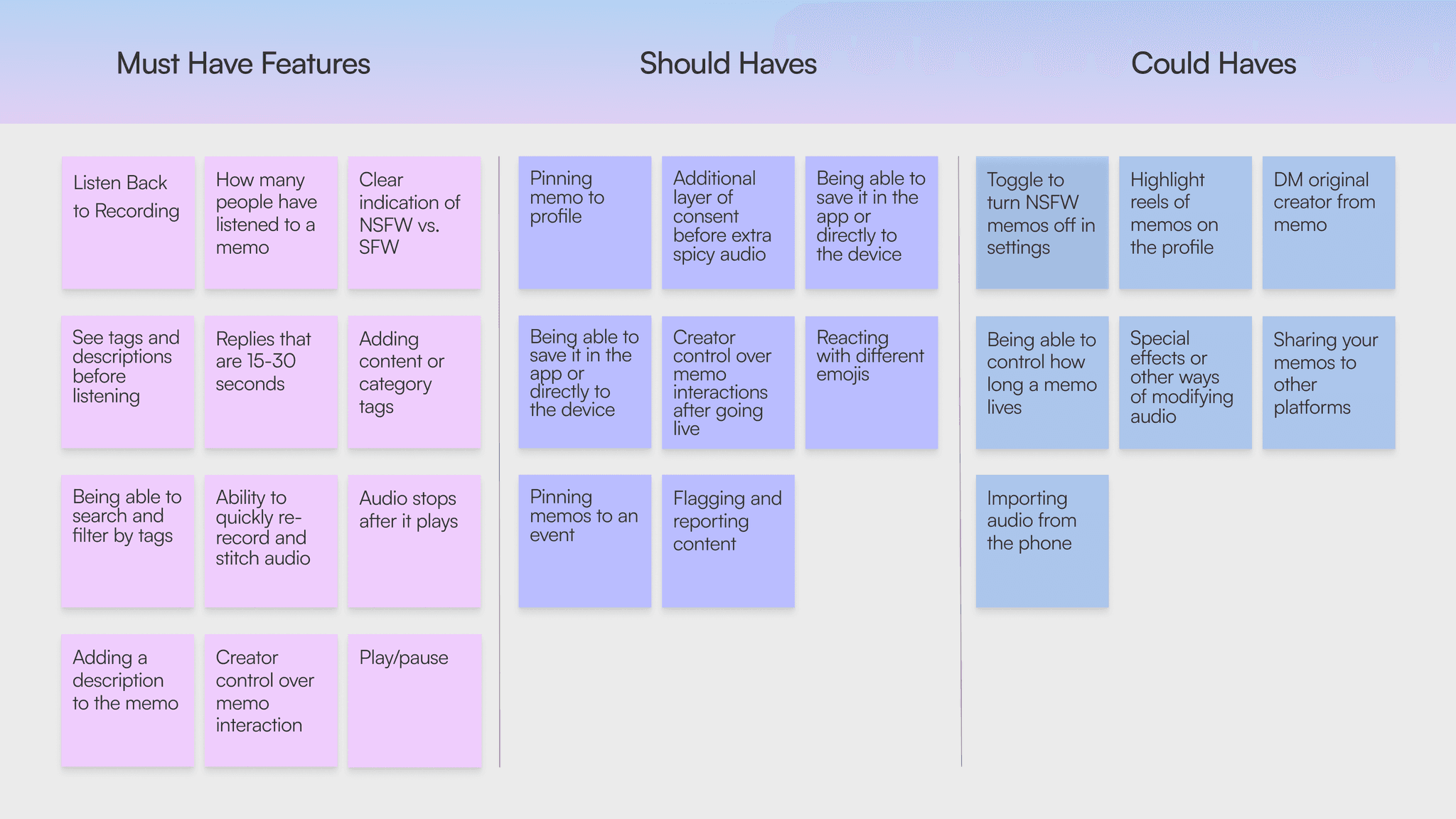 Being that MŌN is currently a MVP, my team was asked to design the memos feature as an MVP as well. We did not include solutions to some of the problems we found in our research. Based on our research, we recommended including the following features to meet user needs and wants when possible.