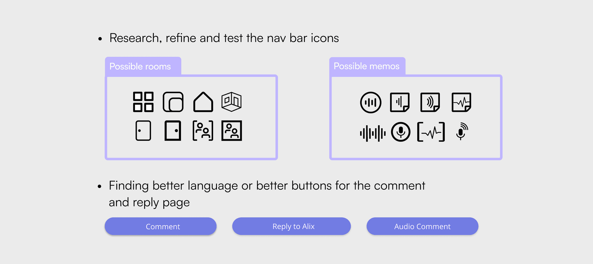 As mentioned previously, the time restraints of this project did not allow for all aspects of the design to be tested as throughly as we felt necessary. Bellow are some possible navigation icons we included with our designs to be tested. As well as, possible call to action buttons that could be tested for the memo comments page.