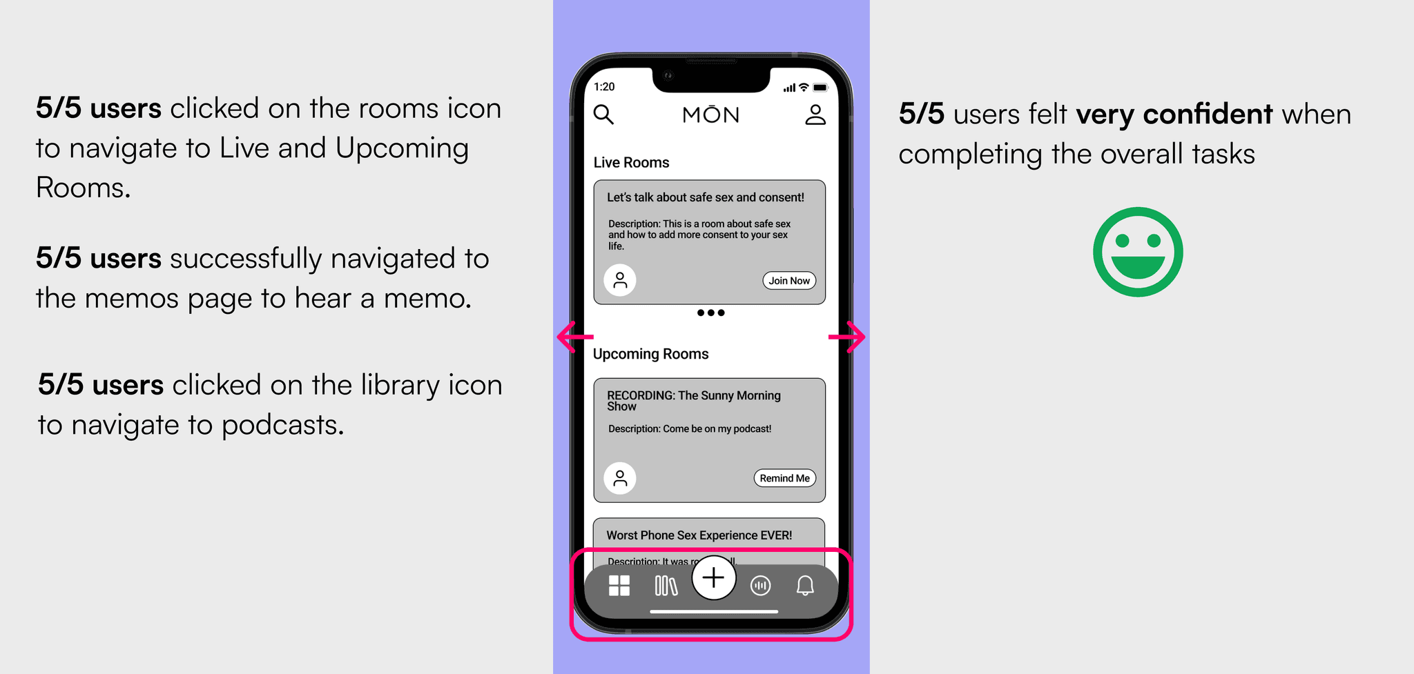 We conducted a second round of usability testing on our high fidelity prototype with actual MŌN users. Unfortunately this took longer than expected and we did not have time to test revisions made based on this round of testing. Although the results were overall favorable. We passed on a few revisions to MŌN’s CEO as suggested next steps which we did not have time to back up with a third round testing.